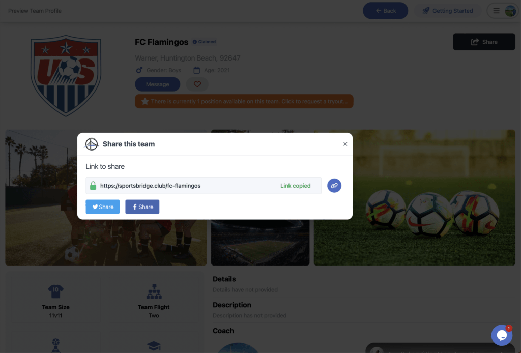 Once you click the share button a popup will open, here you will see your custom short link with your teams name at the end, as well as quick links to share your profile straight to Twitter and Facebook.
